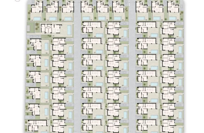 Villa's: Onafhankelijke woningen met drie slaapkamers en 2-3 badkamers, beschikbaar met één of twee verdiepingen. Elke villa heeft een privézwembad, een solarium en parkeergelegenheid op het perceel. Optionele kelders zijn ook beschikbaar.