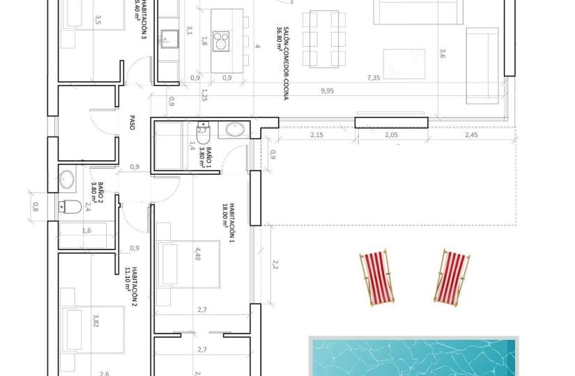 Dagzone: Hier vinden we een ruime woon-eetkamer met open keuken (keukenmeubels inbegrepen) die via twee grote ramen in verbinding staat met de grote, moderne veranda, die toegang geeft tot de aangelegde buitenruimte en het zwembad.