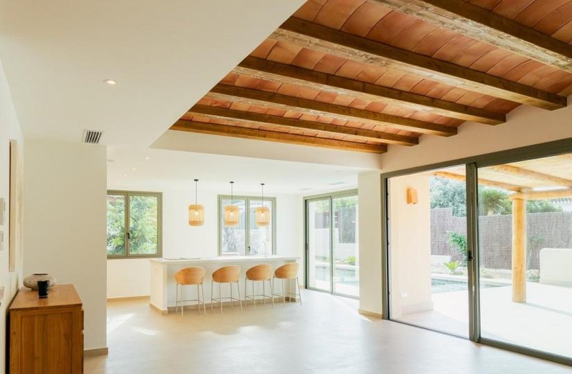 Ontdek deze prachtige, sleutelklare villa in de rustige urbanisatie Valle del Sol, op slechts een klein eindje rijden van het centrum van Javea en op slechts 2,5 km van het populaire strand El Arenal. Het pand is ontworpen met een mix van mediterrane en Ibiza-invloeden en heeft zachte, gebogen lijnen, zichtbare houten balken en gewelfde plafonds die een warme en authentieke sfeer creëren. Grote ramen met luiken vullen het huis met natuurlijk licht, wat het gevoel van rust en comfort versterkt.