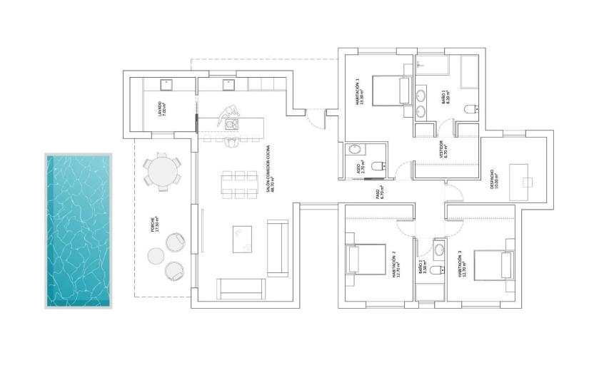 tot het zwembad. Het licht stroomt elke hoek binnen dankzij de grote ramen in de woonkamer, die uitkomen op de veranda, een moderne en functionele ruimte die uitnodigt om optimaal van het buitenleven te genieten. Stelt u zich eens voor: middagen doorbrengen met familie en vrienden, omringd door een rustige en natuurlijke omgeving. Als extra ruimte is er een wasruimte die strategisch is gelegen in de indeling van de woning, waardoor deze vanuit elk punt in het huis gemakkelijk bereikbaar is.